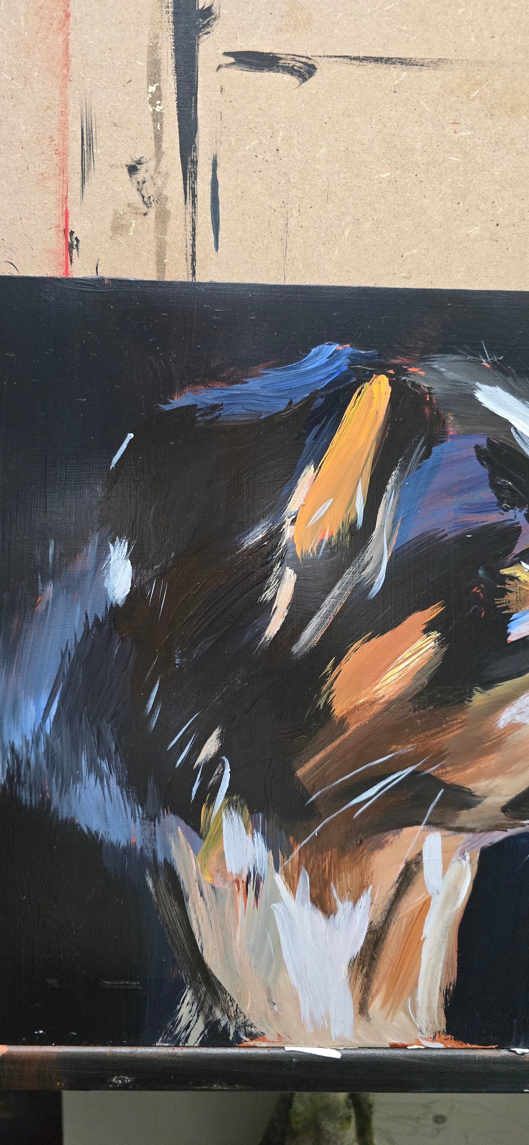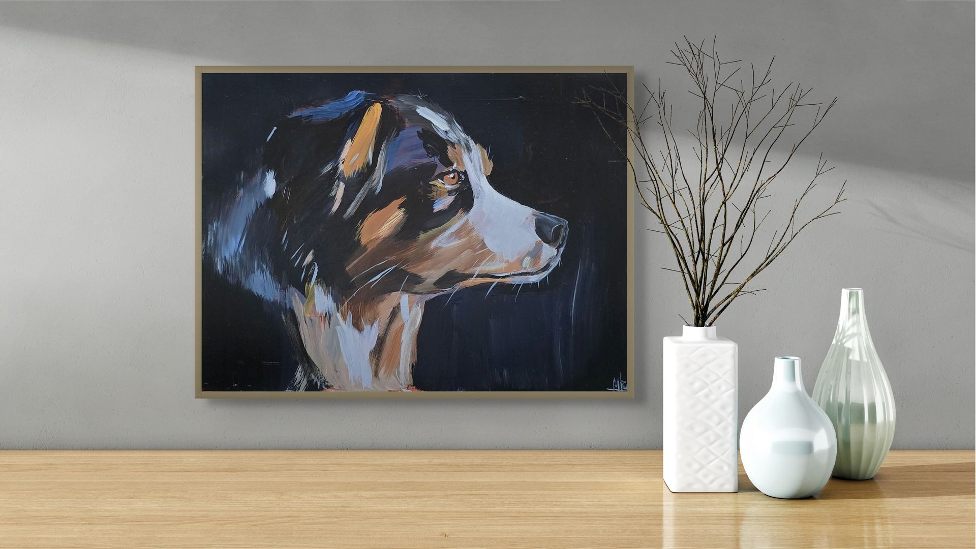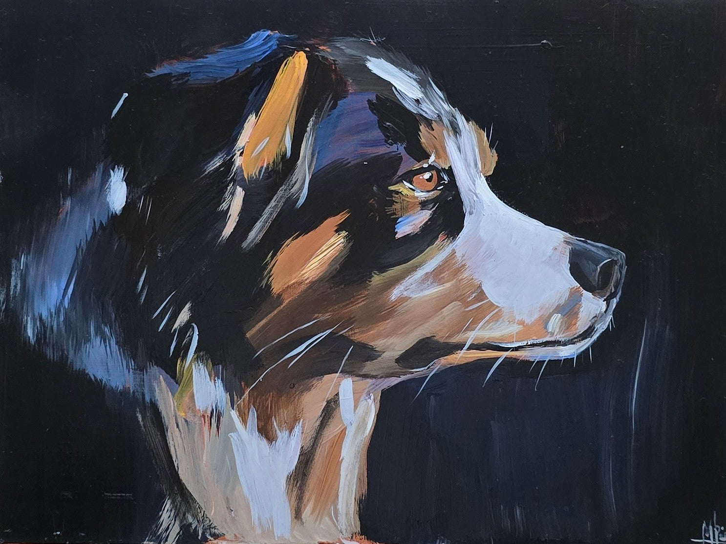 A bold and soulful portrait of an Australian Shepherd, painted with expressive brushstrokes and rich, contrasting colors. The side profile captures the breed’s sharp focus and quiet strength, making it a striking centerpiece for any collection.