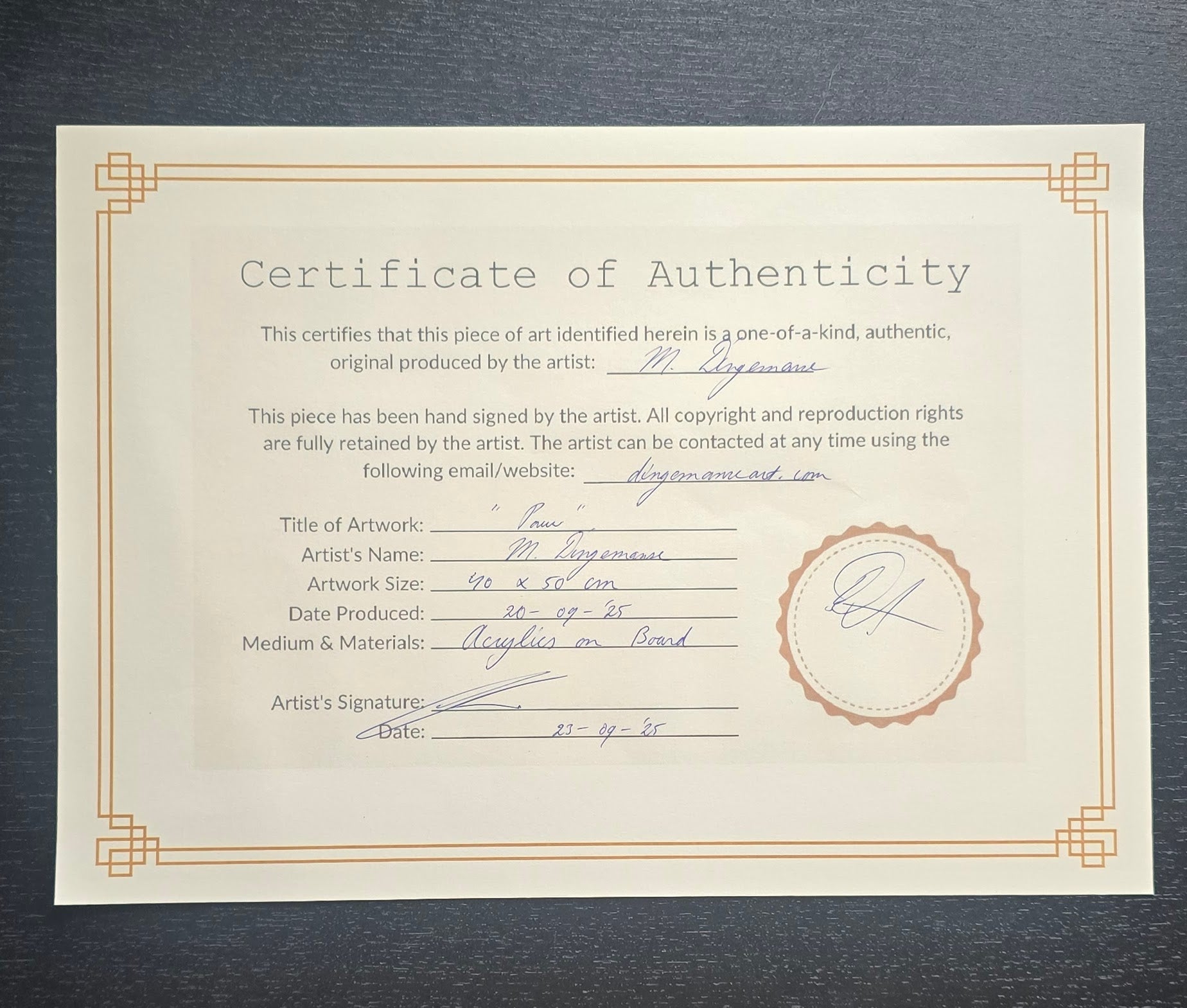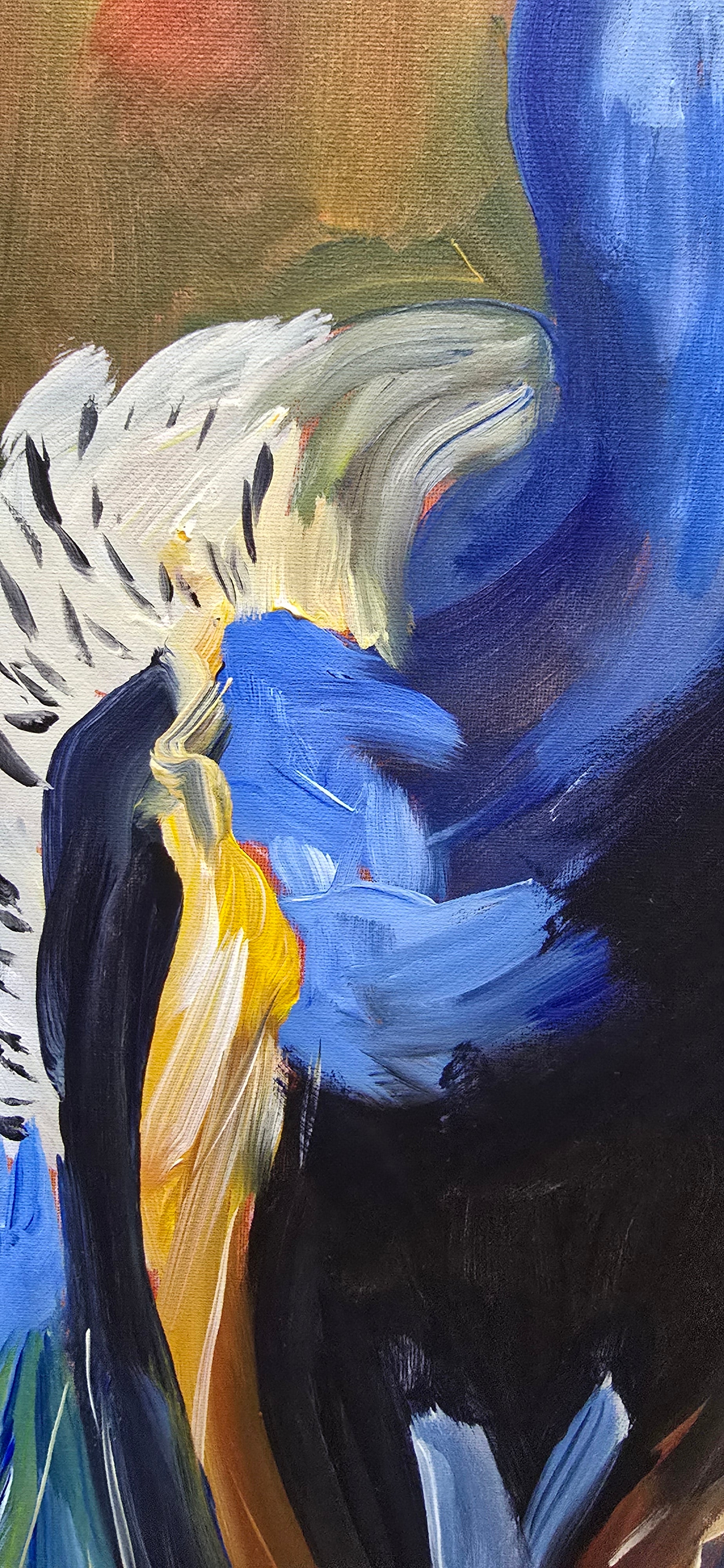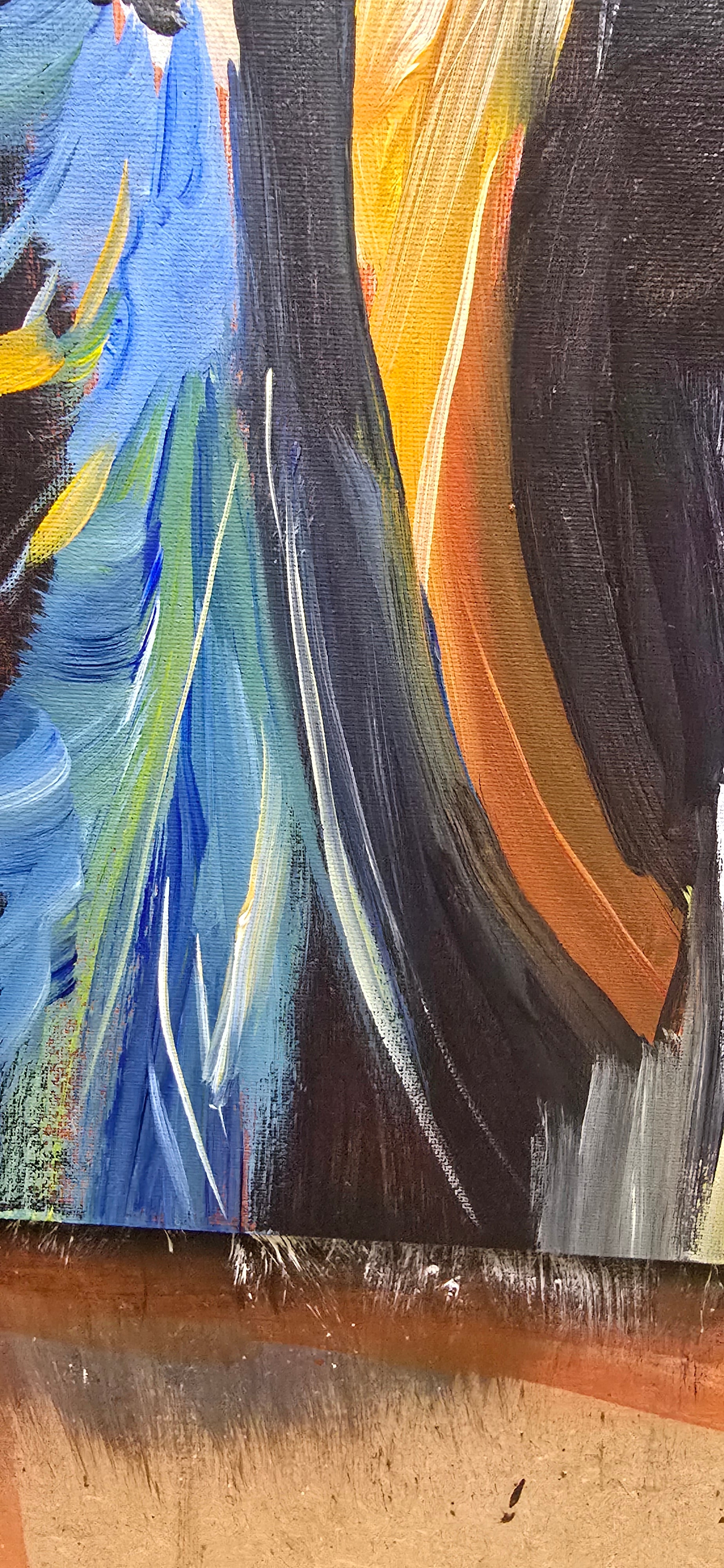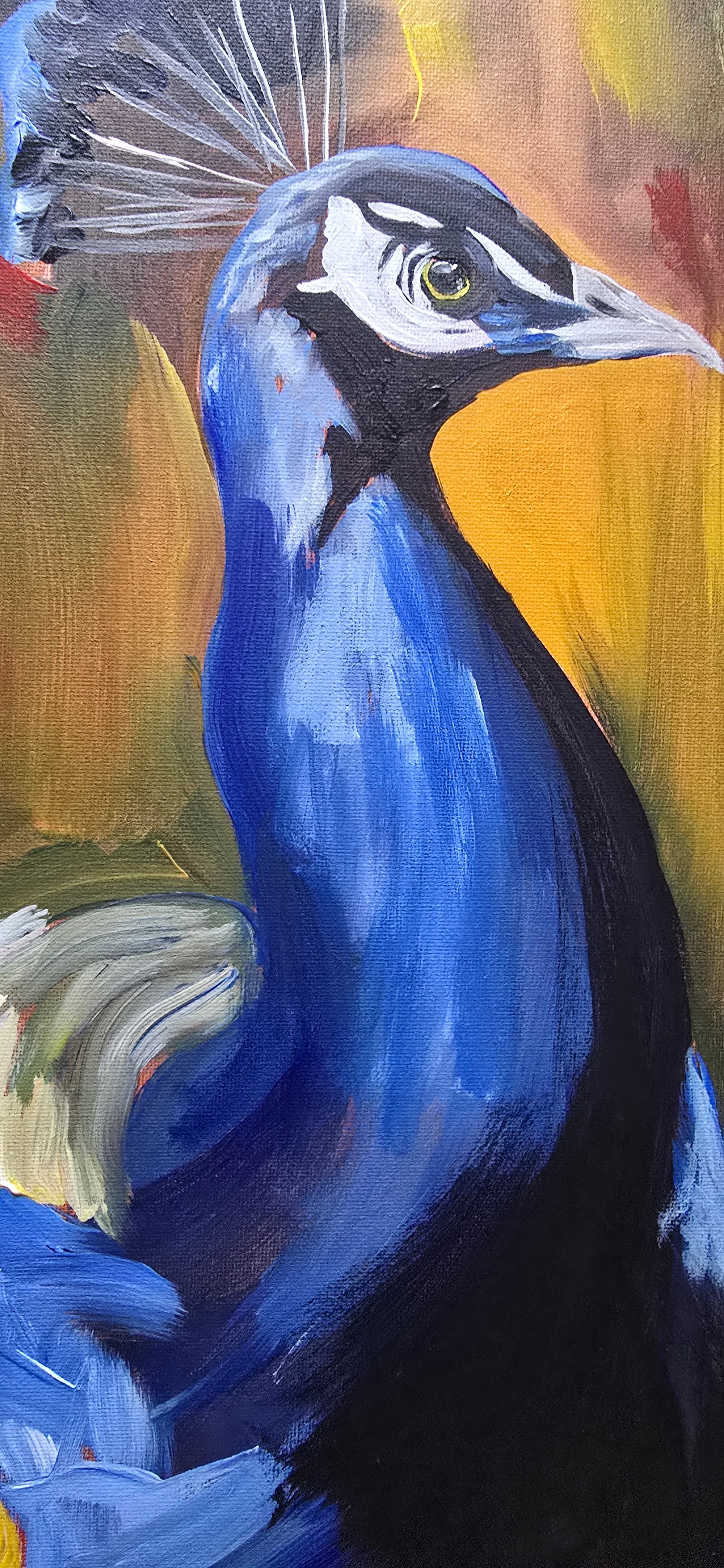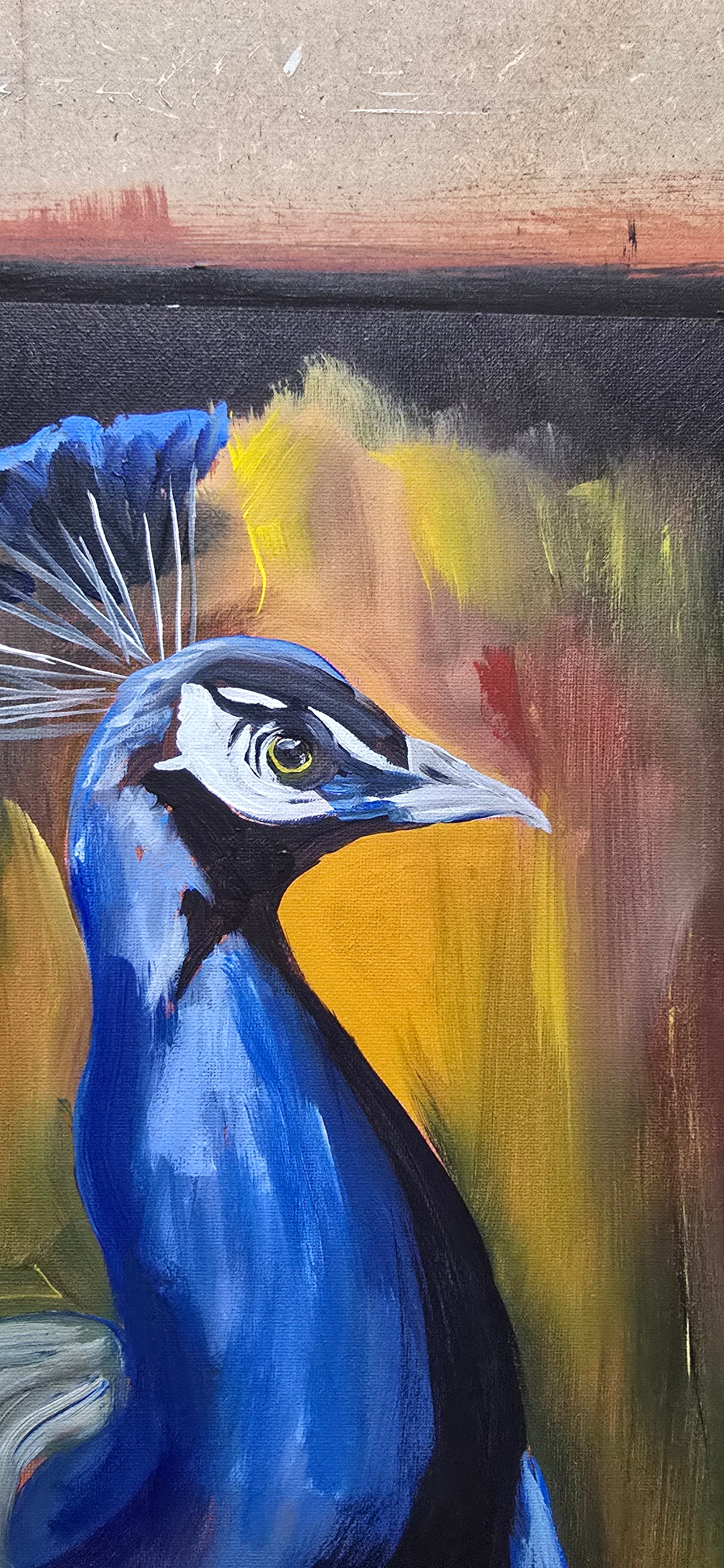 An elegant and colorful painting of a peacock, created with acrylic on panel. The interplay of colors and details brings to life the beauty and pride of this majestic bird.