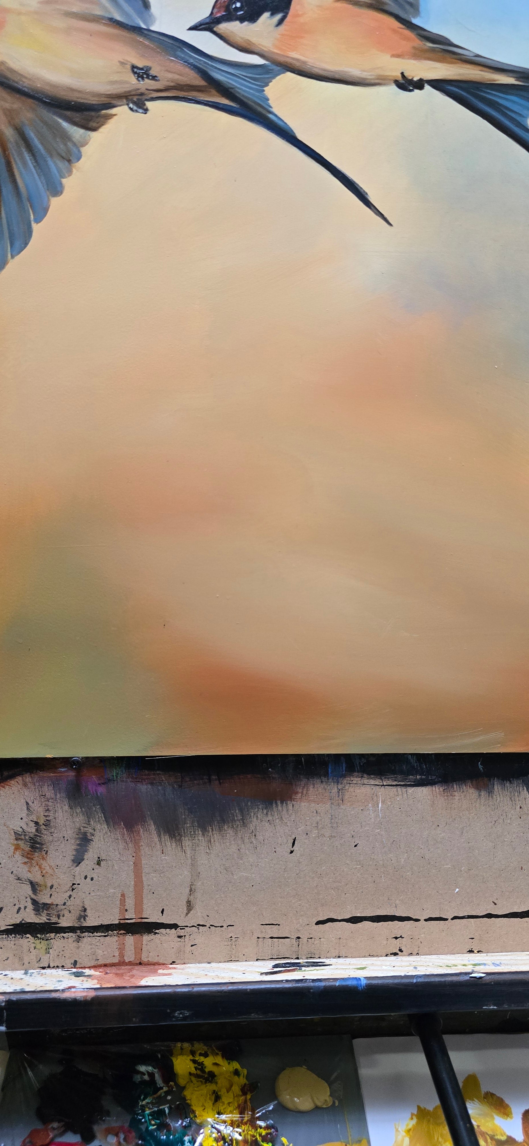 A vibrant and uplifting painting of three swallows soaring across a summer sky. The bold brushstrokes and rich colors capture the lightness, freedom, and energy of these graceful birds in motion. Painted in oils on dibond, the piece is not only full of life and color but also durable and long-lasting, making it perfect for collectors and nature lovers alike.